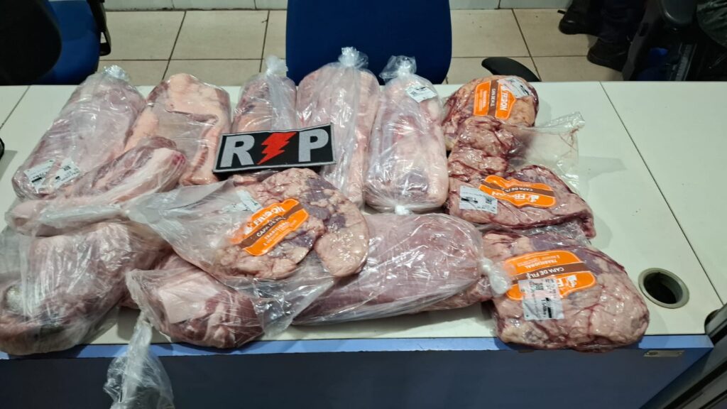 Durante a abordagem e revista pessoal, os policiais encontraram dentro do saco plástico 13 peças de carne, sendo 10 de carne bovina, 2 de carne suína e 1 de peixe. Questionados, os suspeitos inicialmente disseram que haviam recebido os produtos de uma terceira pessoa. No entanto, após novas indagações, acabaram confessando que haviam furtado os alimentos de um estabelecimento nas proximidades.