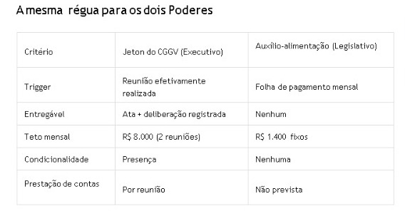 Ou seja: o jeton só é pago se houver reunião, presença e ata. Diferente do auxílio- alimentação dos vereadores, que é pago todo mês, sem reunião, sem entregável e sem prestação de contas individual.